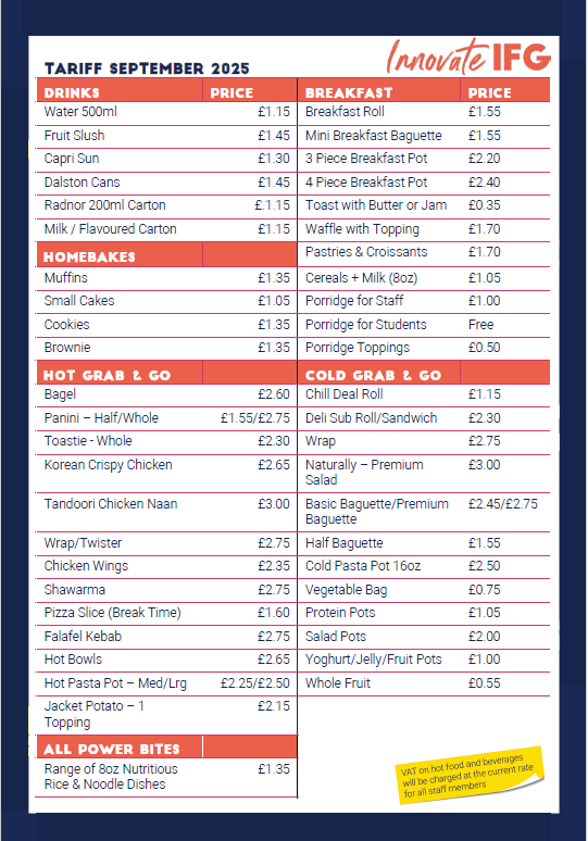 Our Post 16 students have their own cafe in the 6th form block. All usual canteen offerings are available alongside snacks and drinks specifically for 6th form students.