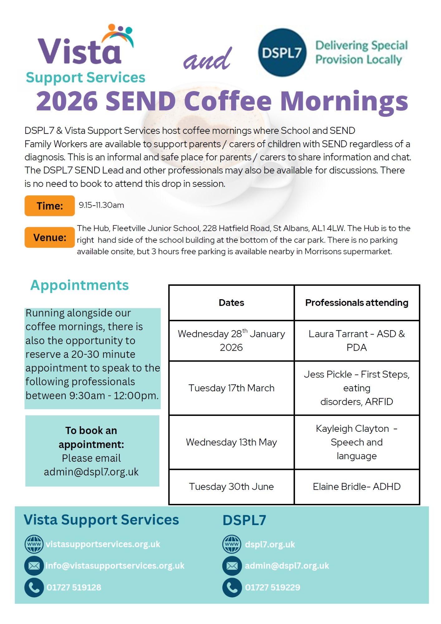 - Family support worker, VISTA and our DSPL7 SEND team are available to chat to with no booking required. Appointments still available.