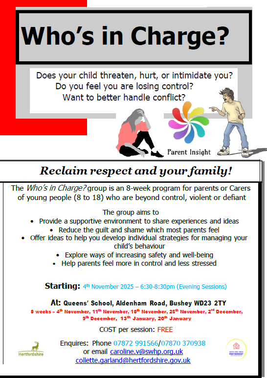 "All of our courses are free to parents living in Hertfordshire, and are run by us – Francine and Lesley. We offer a range of topics to help parents to navigate the challenges of daily life."